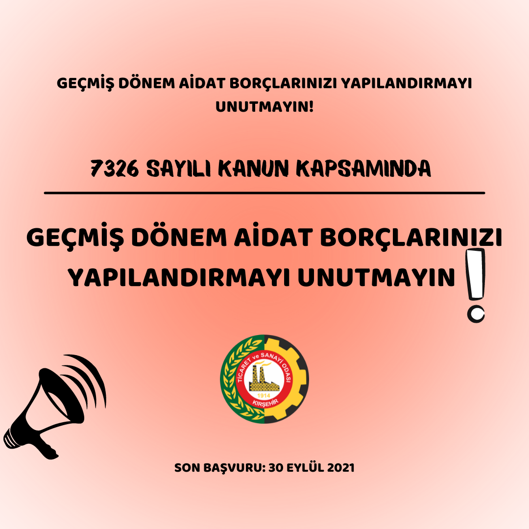 9 Haziran 2021 tarih ve 31506 sayılı Resmî Gazete ile yayınlanan “Bazı Alacakların Yeniden Yapılandırılması İle Bazı Kanunlarda Değişiklik Yapılmasına İlişkin Kanun” kapsamında, Oda veya Borsalara aidat borcu bulunan firmalar, borçlarını gecikme cezasız peşin olarak ödeyebilir veya gecikme cezasız olarak 6 taksitte (kredi kartı) ödemek üzere yapılandırabilirler.