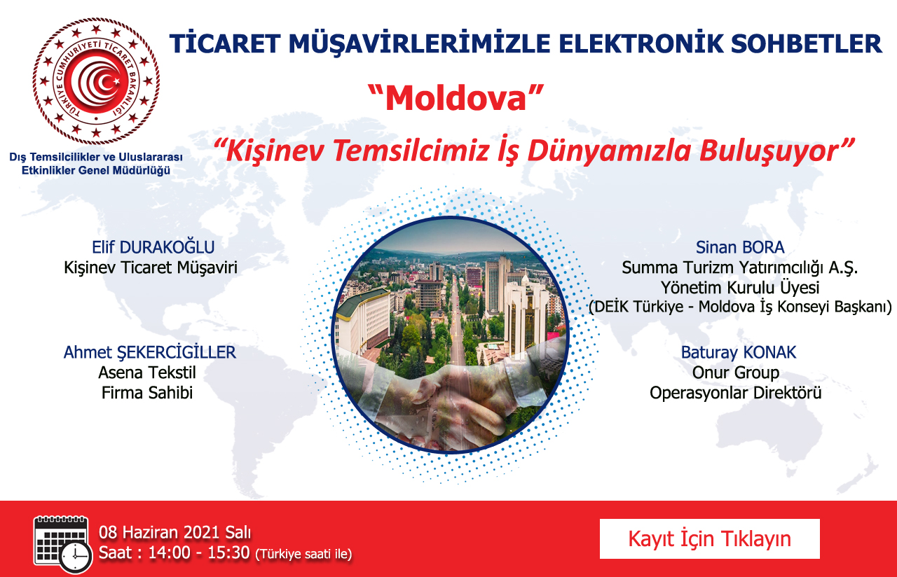 Ticaret Bakanlığı tarafından düzenlenmekte olan “Ticaret Müşavirlerimizle Elektronik Sohbetler-Moldova” e-sohbet etkinliğimiz 8 Haziran 2021 Salı günü 14.00-15.30 saatleri arasında gerçekleştirilecektir.