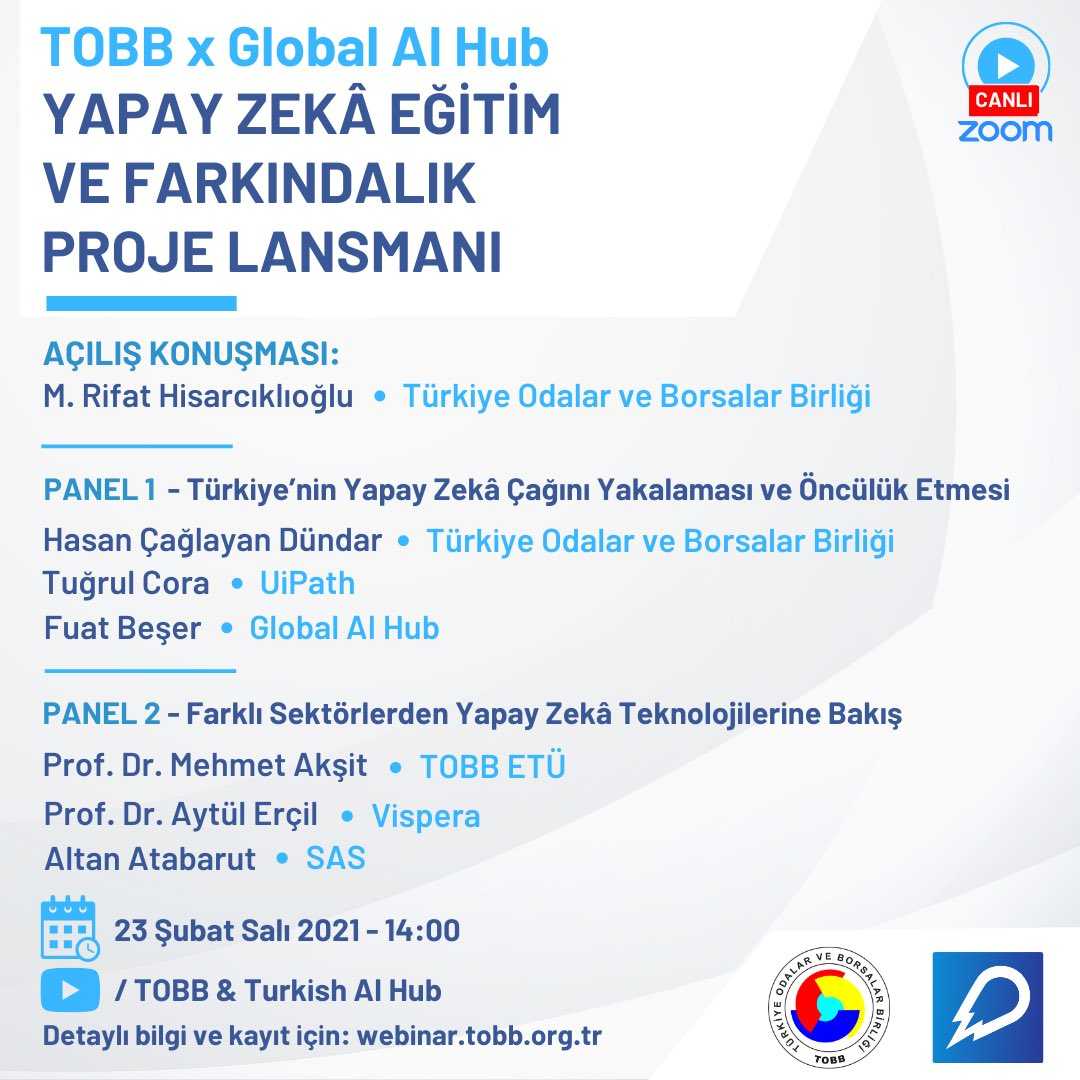Birliğimiz Başkanı @RHisarciklioglu katılımıyla, TOBB ve Global AI Hub işbirliğinde “Yapay Zekâ Eğitim ve Farkındalık Projesi Lansmanı Webinarı”na katılımınızı bekliyoruz.